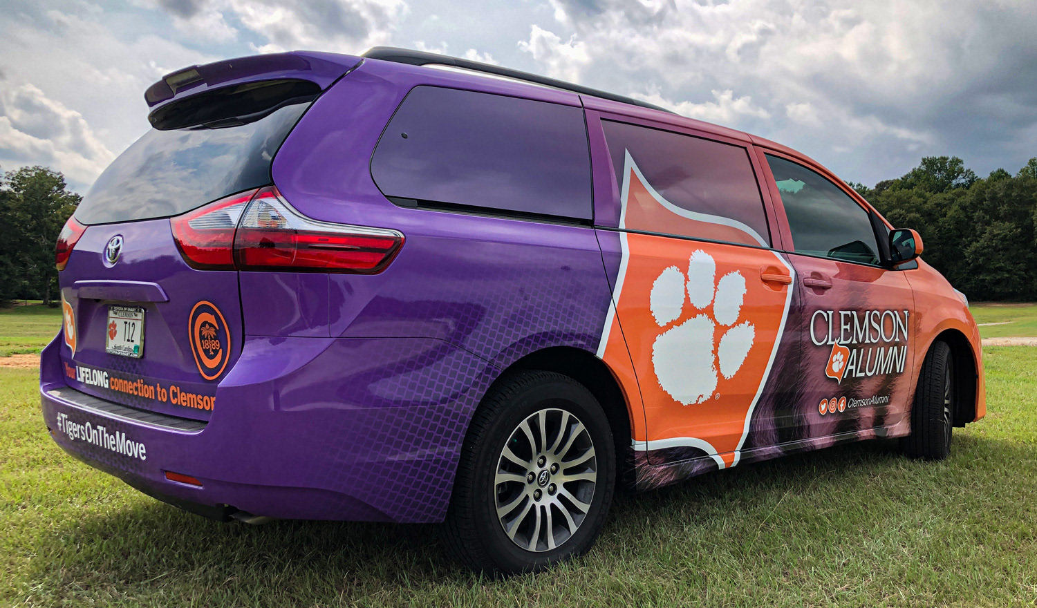 This updated design takes full advantage of the updated Clemson Alumni Brand Guidelines, which brought about updated logos and colors, as well as a stronger use of the Tiger Rag as a centralized icon. The front and rear of the vehicle includes tinted Tiger Rag patterns coming off the front bumper and hood as well as the rear wheel wells.