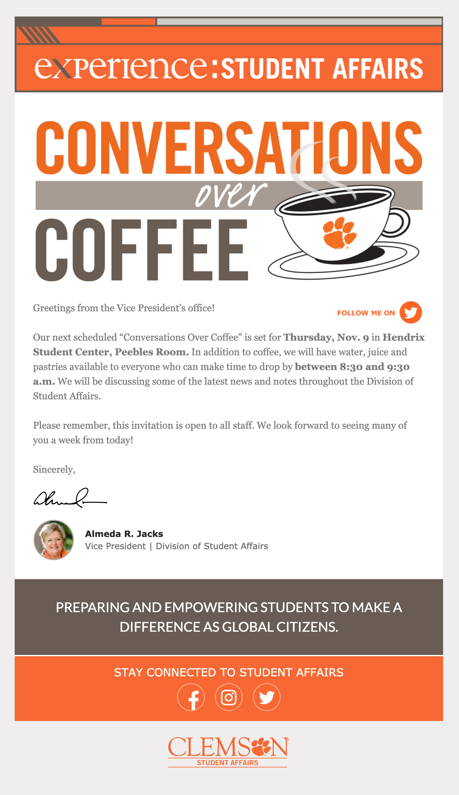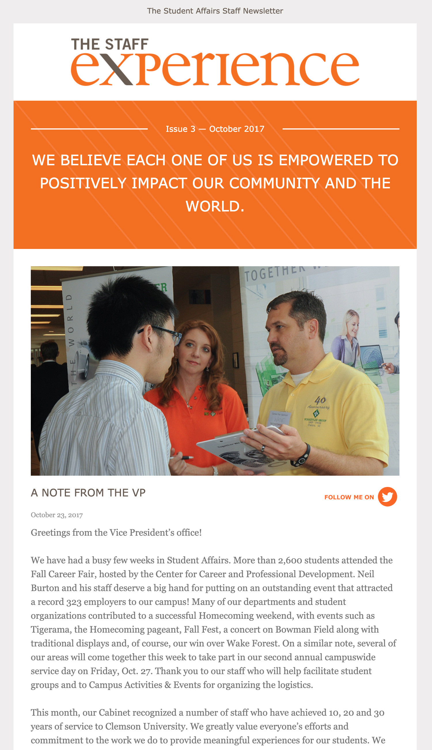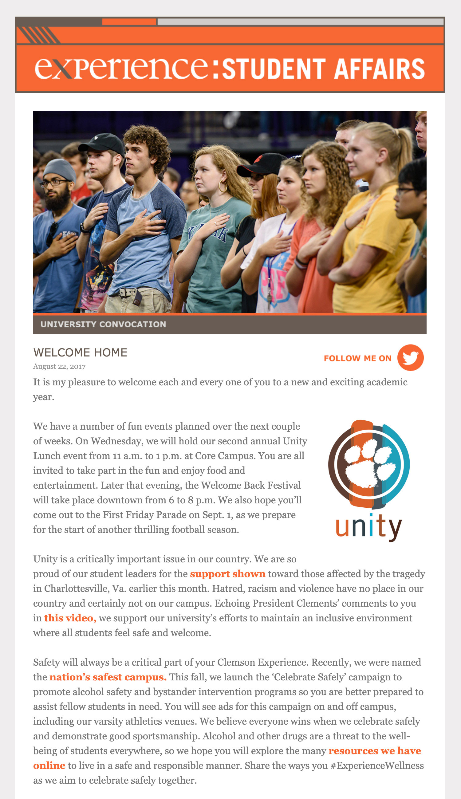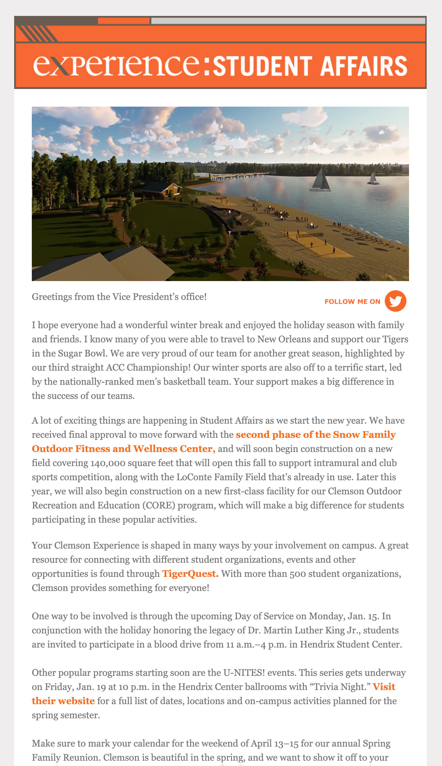 Over the years I've had opportunities to work on HTML email designs, starting with simple table-based setupsĀ and eventually moving into more responsive layouts. One of the last projects working for Student Affairs Publications at Clemson University was to help them setup those emails. Below are a few examples of the last ones I worked on.